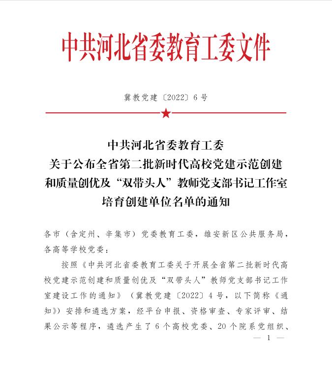 近年来,开云手机站登录入口党委以习近平新时代中国特色社会主义思想为指导,按照新时代党建工作的各项要求和上级党建工作的整体部署,紧紧围绕立德树根本任务,积极主动对标争先,推动全院各级党组织全面进步。目前,开云手机站登录入口共有河北省党建工作标杆院系1个、“双带头人”教师党支部书记工作室1个,校级“双带头人”教师党支部书记工作室1个,将发挥更大的示范引领作用。