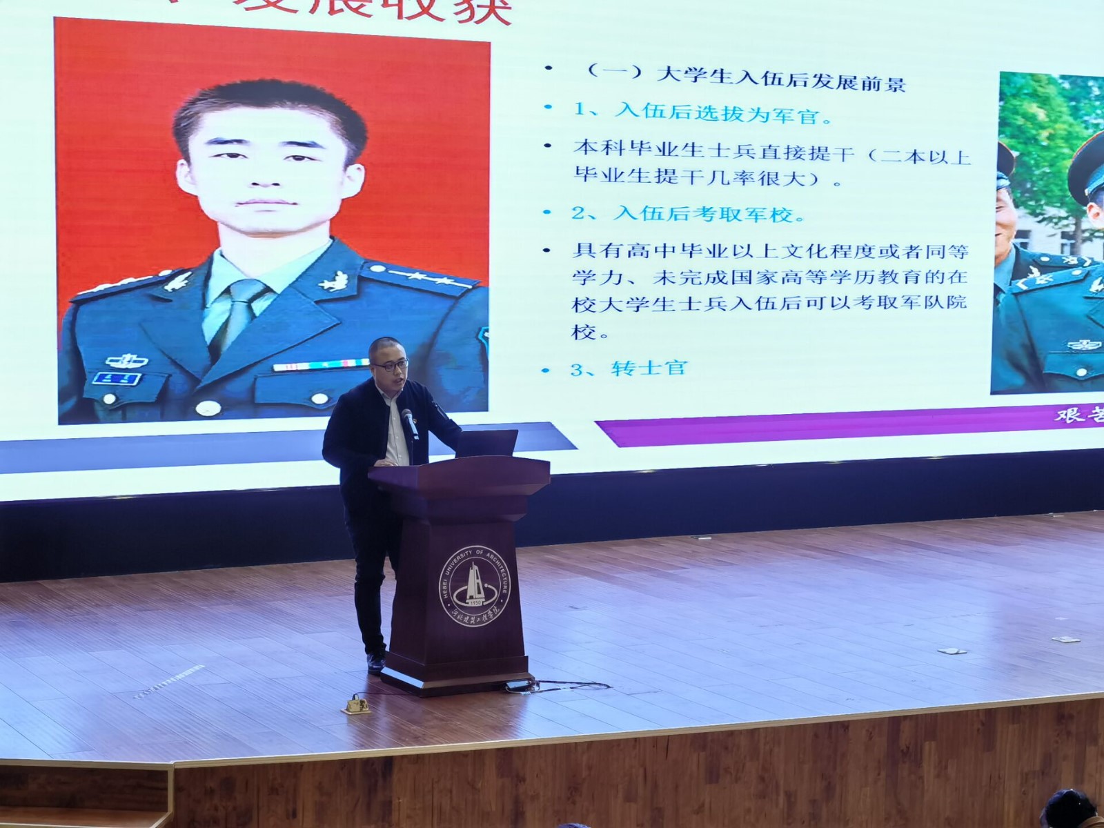 最后,赵成刚老师作动员大会讲话,他希望广大青年大学生要关心支持国防建设,做新时代忠诚爱国者;切实提高大局意识,充分认识大学生在国防事业中的重要作用;把握机遇,积极响应国家号召,自觉履行兵役义务,奔赴军营锻炼成才。